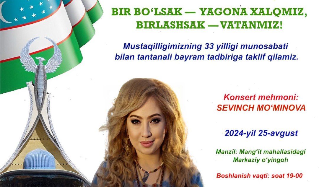 Konsertda estrada xonandasi Sevinch Moʼminova hamda viloyatimiz va tumanimizning taniqli xonandalari ishtirok etadi. Tadbir davomida ajoyib mushakbozlik guvohi ham boʼlasiz.